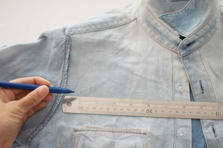 1. Turn your shirt inside out and use a pen to mark a horizontal line where you want the bottom of your cut out to sit.