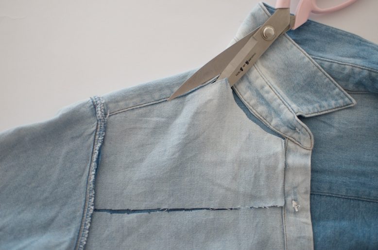 2. Using your scissors, start cutting out the fabric, following the seams of the shoulders, button strip and neckline.