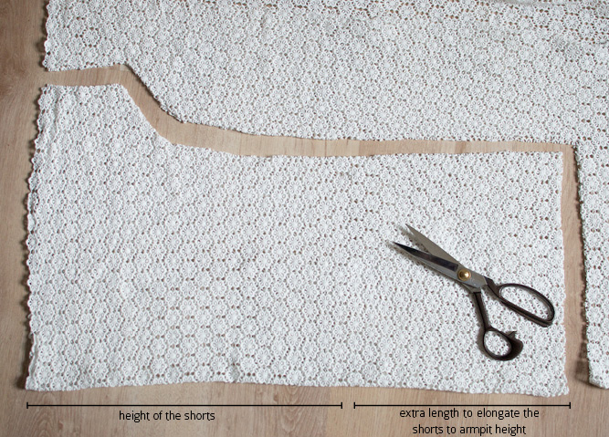 4. Instead of cutting the fabric to be in line with the waistband of the shorts, I added another 30 cm or so (the space from your waist to your armpit). Cut a second piece exactly the same.