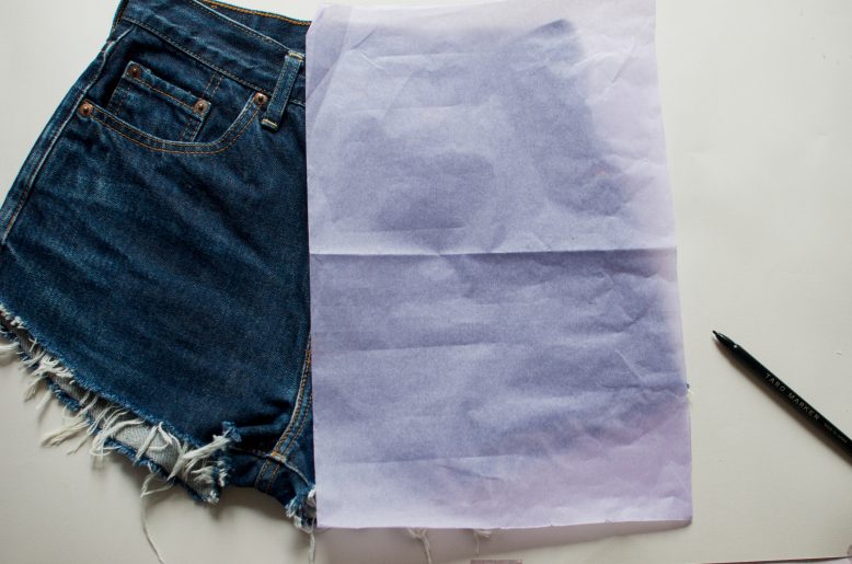 1. You are going to do the embellishment in two different sections for each side of the shorts. First, lay the tracing paper on the top of one side of the shorts.