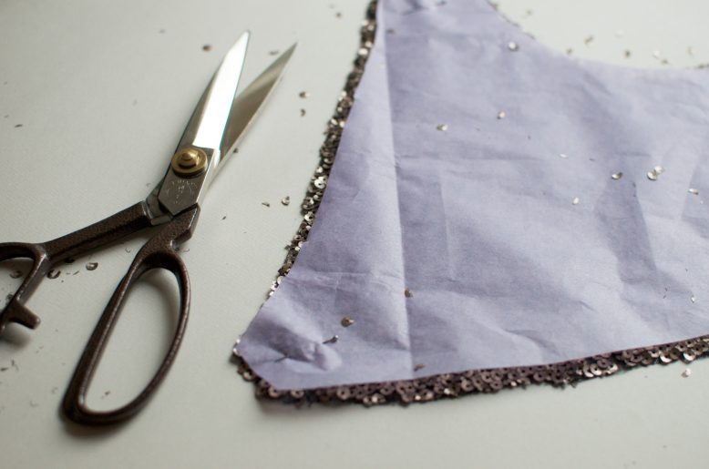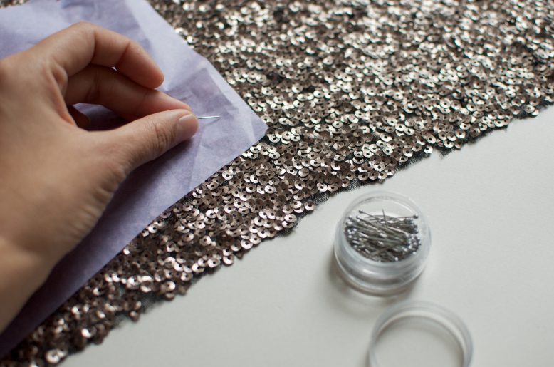 3. Pin the pattern to the sequin fabric right side up.