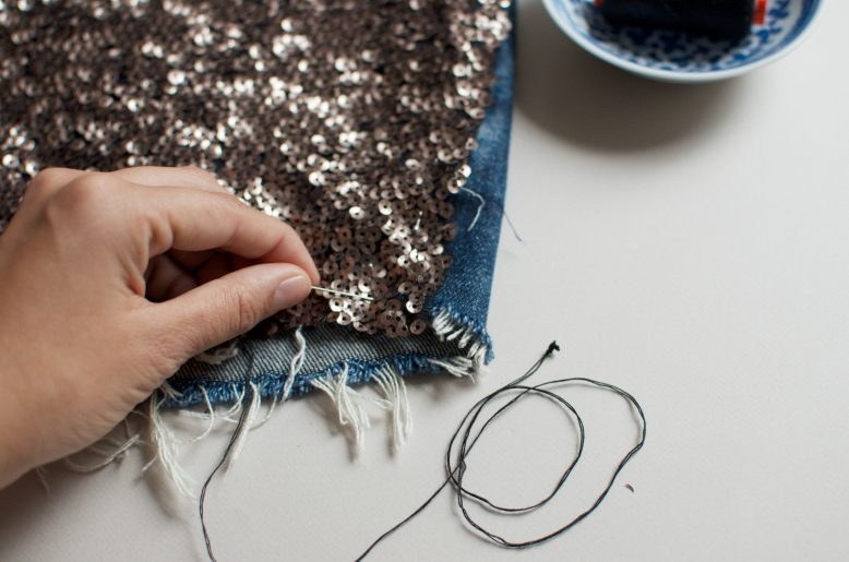 5. Use your needle and thread to carefully sew the edges of the sequin fabric to the denim shorts – I ran along the edges to secure the sequins so they didn’t fall off where the fabric was cut. Do this for both pieces of sequin fabric, making sure to line up the middle seam carefully so there’s no gap.