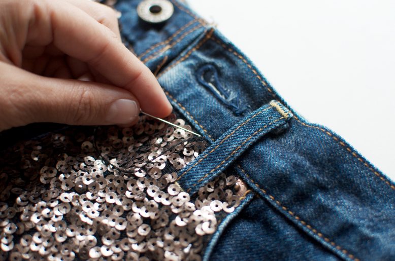 6.  Cut a slit so the beltloops of the jeans can still be seen and then sew around to secure. If required, trim any excess sequins along the hem and waistline.