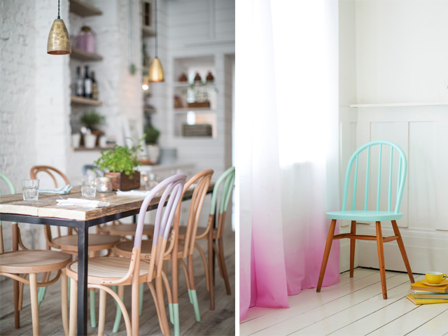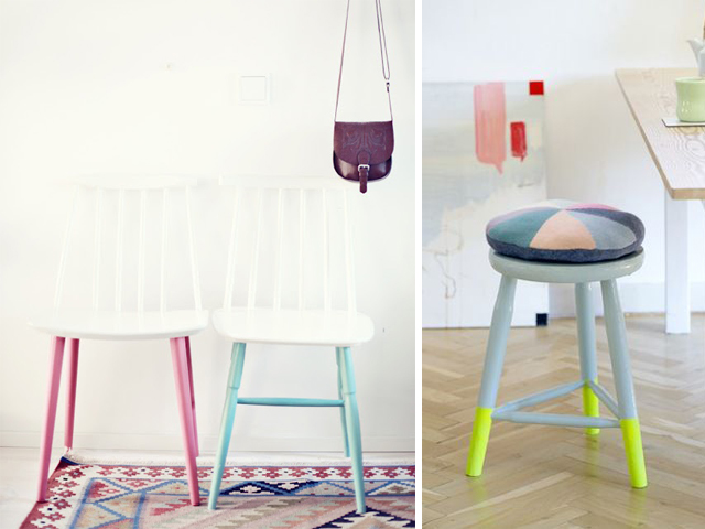 Neon or pastel, either way there’s something just so right about a pop of colour in a simple and minimal room – and paint dipped chairs present the perfect opportunity. Next time you’re at a garage sale why not pick up a few old chairs and breath some life into them with a lick and a dip of paint?