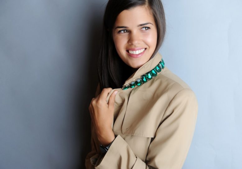 3. Press the rhinestone onto the pocket or under the collar of the trench and then use your needle and thread to sew into place.