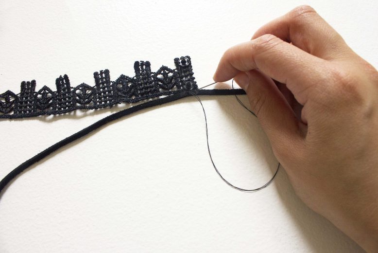 Sew one end of the lace to the centre of the leather cord. This step might be a little confusing because the lace clips together at the back of the neck while the leather cord ties together at the front of the neck so the two can only be joined at the back.