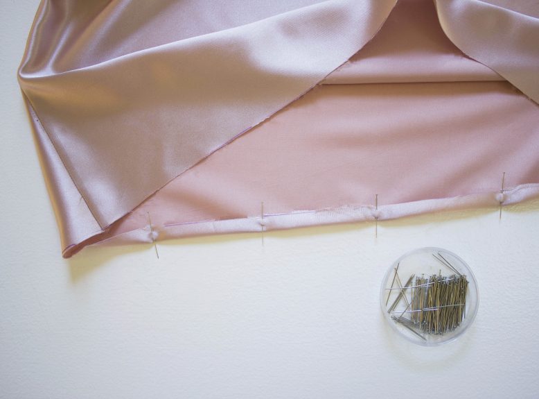 Pin and sew the hem up 1cm along the bottom edge of the cami. Hint: a quick sewing hack when it comes to the hems of sheer and silk fabrics is to apply a thin layer of clear nail polish to the edge (like you do with runs in stockings). Apply just enough to stop the threads from unraveling. Easy as!
