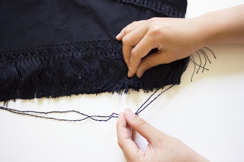 Once you're happy with the position of the tassel, sew it into place. For our tassel trim, we had to remove the extra thread that stopped the tassels from getting tangled.