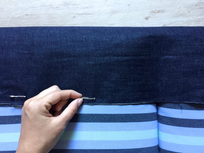 Wrap the long sides over and pin to the back of the cushion, placing safety pins all the way down so that there are no lumps or folds in the fabric.