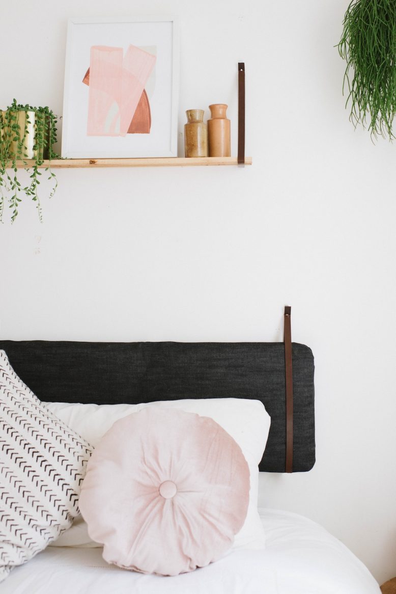 The reason I use pins instead of glue or sewing to secure the fabric for this headboard is so that you can change up the fabric easily – make it a great piece if you tend to change your mind all the time like me! I also added another DIY hanging shelf above the bed using the same leather as the headboard… Easy!
