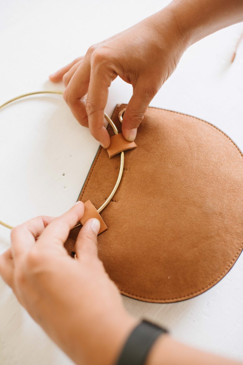 Cut two small lengths of leather. They should be long enough to cover the ring and with space for the edges to be glued onto the bag.