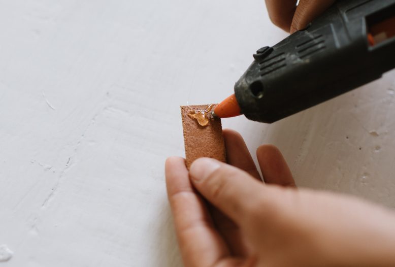 Heat up your glue gun and put two small dots of hot glue onto the two inside ends of the leather piece. You will need to do this quickly so they glue doesn't dry... Be careful of burning yourself!