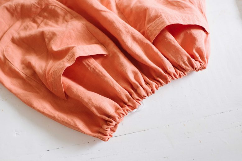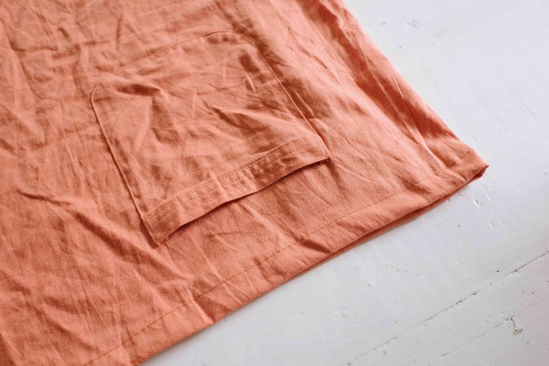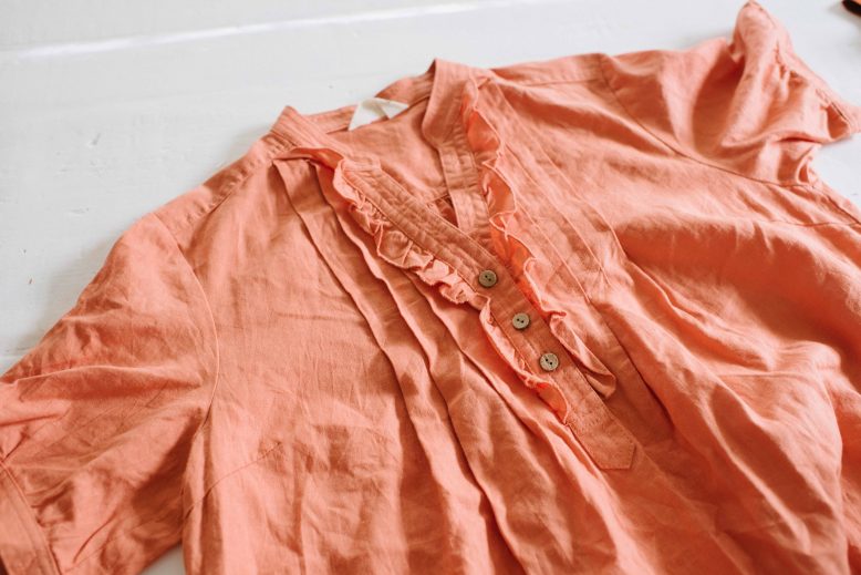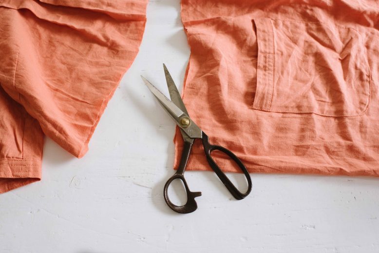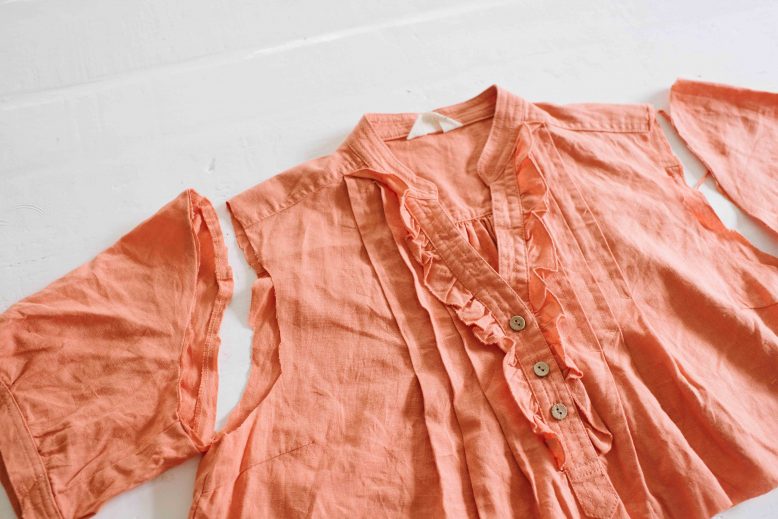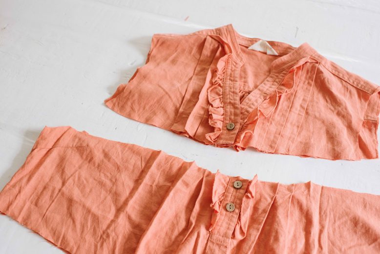 I stumbled upon this orange dress (see a pic below – ick!) in a secondhand store and whilst it was pretty unappealing, I was immediately drawn to the natural linen feel of the fabric and the holiday vibes of the colour (you’ll remember from this blog post that I’ve had these colours on my mind). She’s got potential guys! I didn’t know what I would do with it at the time, but once back in the studio I decided on a top and skirt set. Read on to see how to do it yourself.