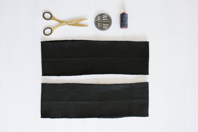 The main thing about this project is finding the right fabric. It might not be familiar straight away but look harder and it’s often used, folded over, as cuffs or waistbands on bomber jackets. I found mine at Spotlight in Australia, and it’s available in most big craft stores in the sewing and haberdashery section. It’s also available online on  Ebay and Amazon (see here and here) and is usually referred to as ‘knitted waistband or cuff fabric/trim’. Make sure you buy large, long lengths and not ones made into cuffs already(!).