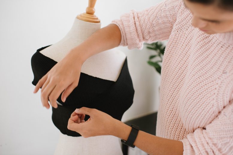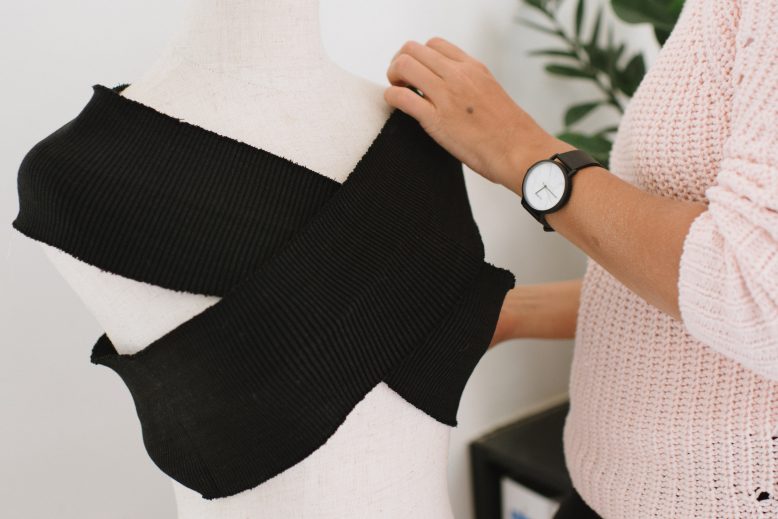 These pieces I have were 15cm (6 inches) wide and about 1m (40 in) long, joined into a loop with some stretch, but you can go wider if you have a bigger bust. Alternatively you could sew two pieces together lengthwise for even more coverage. In the end you’re looking for two stretchy loops of fabric that sit snugly on your body, so if you have to sew a long piece into a tube that’s fine too.