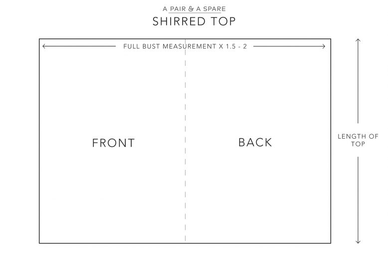 We’ve done a quick pattern below to show you how to cue out your fabric – we suggest doing 1.5 times your bust for the width, but if you fabric is very light it may shirr more in which case we would suggest doing 2 times your bust as the width. For the length, you can choose whatever you like, just remember you need to hem it so to add a seam allowance.
