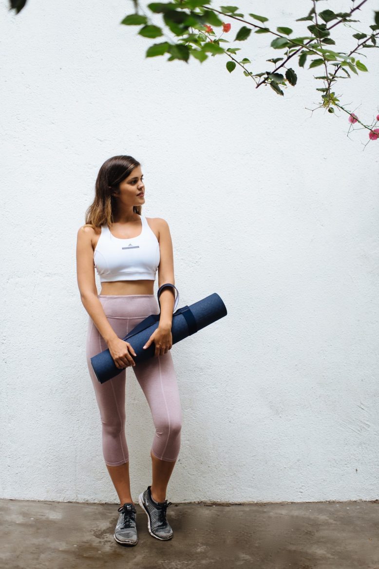 Outfit Details: Grana ¾ Leggings, Adidas by Stella Mccartney Pull on Climacool Sports Bra in White via Farfetch, Nike Shoes, Adidas by Stella McCartney Yoga Mat via Farfetch.
