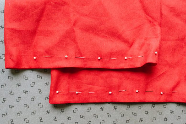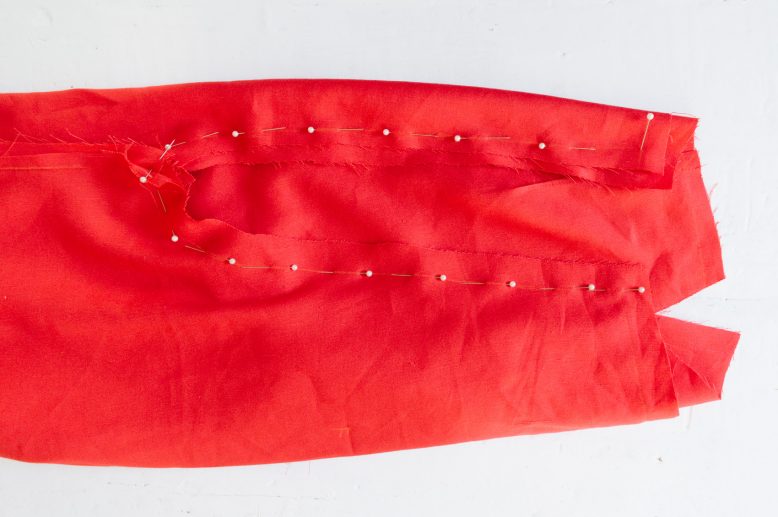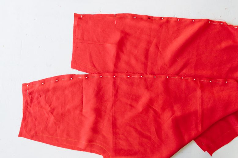 Start sewing your pants together by first pinning down the side and inner seams. Pin and sew the front and back pieces together for each pant leg.