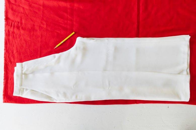 Start by copying the pattern off a pair of wide legged pants. Fold the trousers in half and trace around the edges. You'll need to do this for both the front and back panels. And you'll need to copy the pattern twice for both the panels, where you'll end up with mirrored pieces after tracing and cutting.
