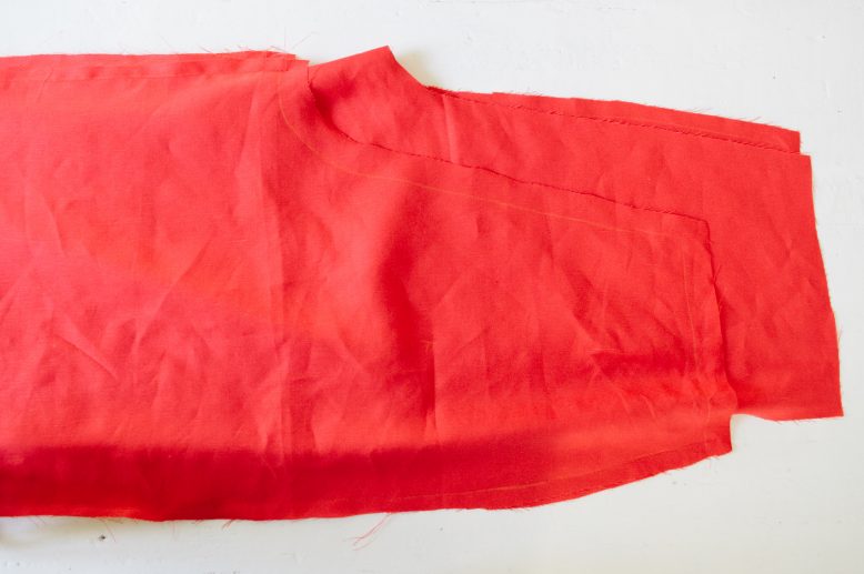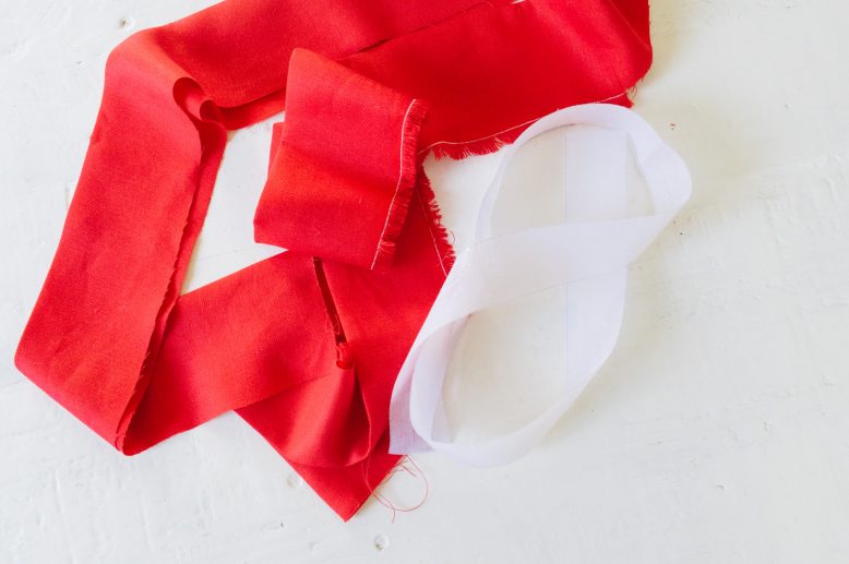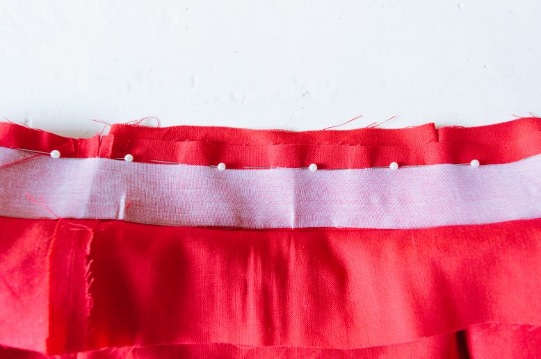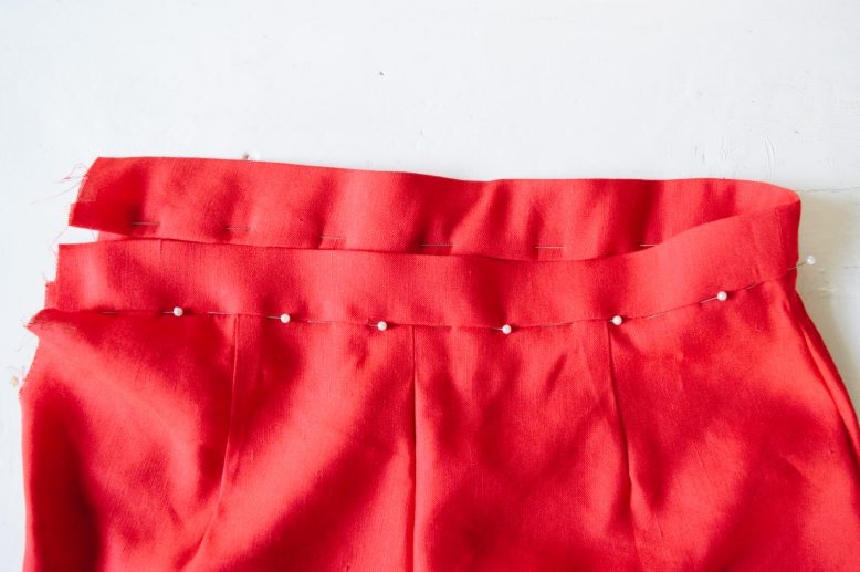Now for the flat waistband! Prepare a strip of fabric the same length as your waistline, plus allowance for the seam. My waistband is to be 4cm (1.5 inches) wide, so my fabric strip needs to be 8cm (3 inches) plus seam allowances, it will then be folded and sewn to the pants. We used interfacing for this too, so it had a little stiffness. The interfacing strip only has to be the same length of your waistline and match the width of the waistband.
