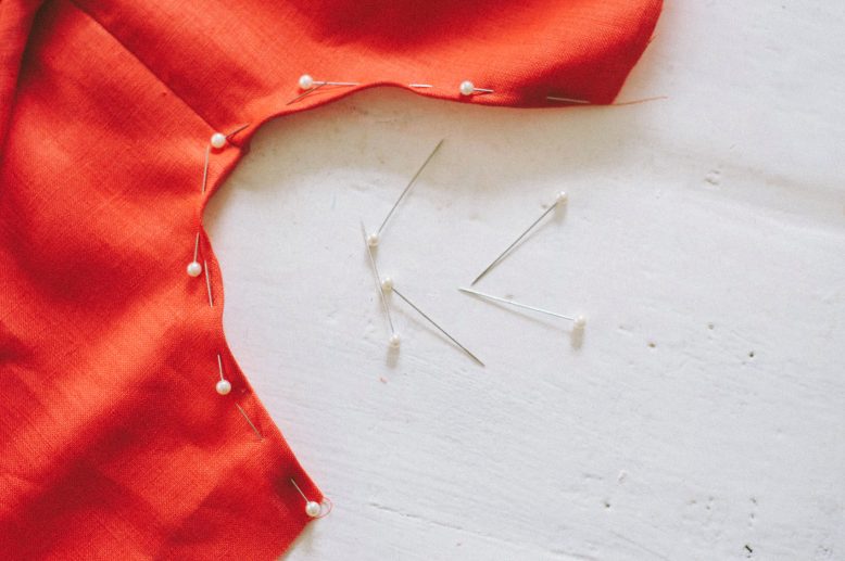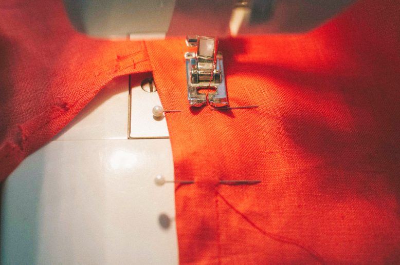 Pin and sew a straight stitch. For this you could also do a bias-cut binding out of the same fabric, or use bias tape to finish the raw edges.