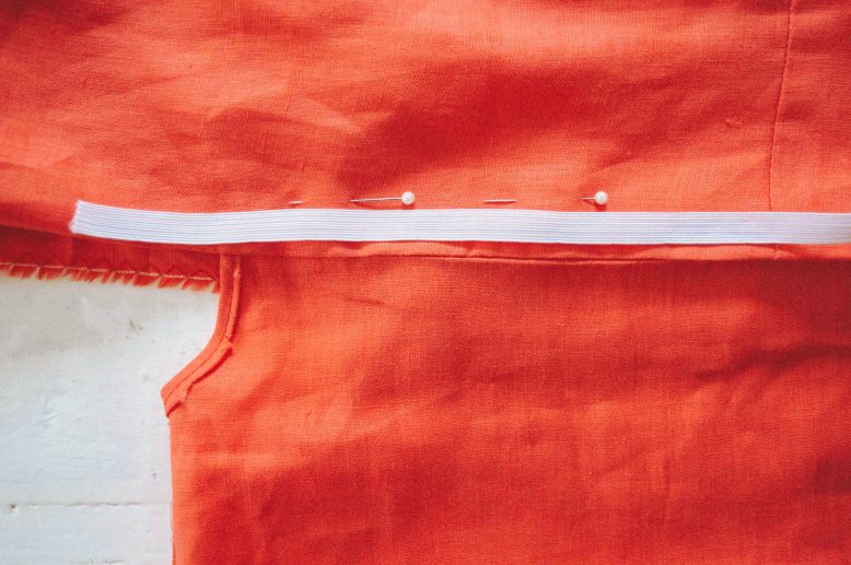 Using the seam allowance, sew a tunnel for your elastic to go through. The length of the elastic can be found by looping it around your shoulders, and tightening the elastic until it's at a comfortable tightness.