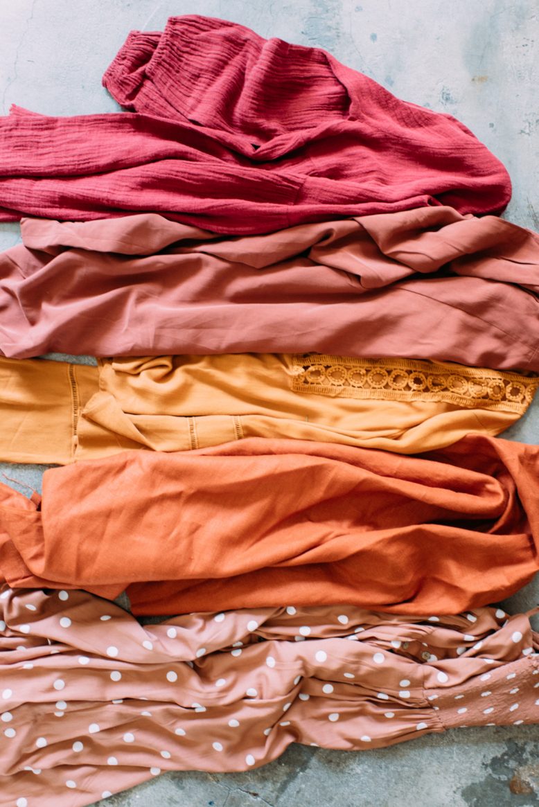 Dusty Rose Dress from Paddy to Palmy, Rust Fabric (I’m going to make something with this soon!), Mustard top from Shilla the Label, Dusty Rose silk trousers from a vintage store, Burgundy linen dress from Arnhem clothing.