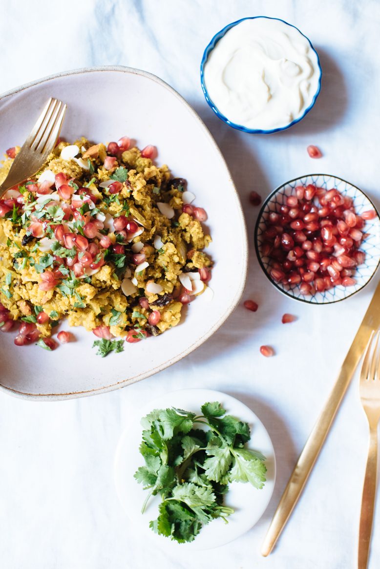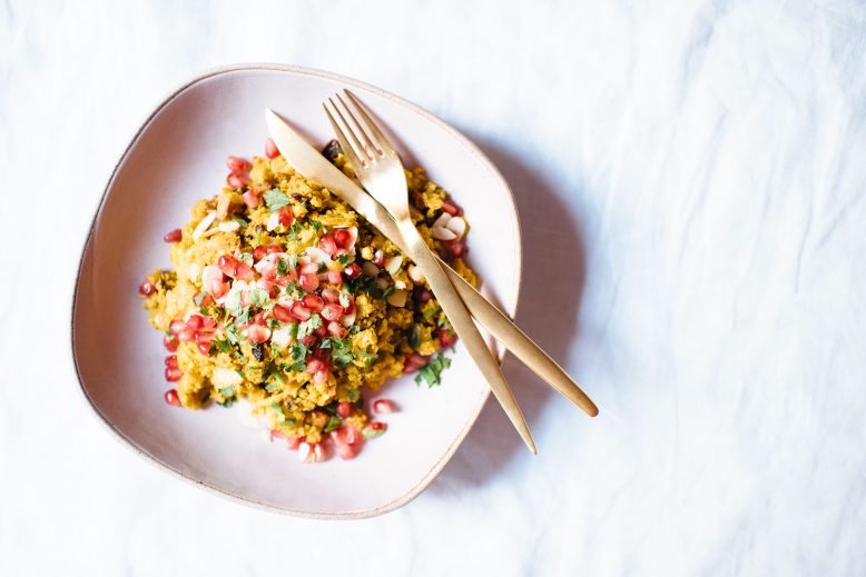 After a weekend of overindulging, there’s nothing better than filling your fridge with healthy ingredients (plus, your body weight in dark chocolate) and planning out a few delicious meals at home. And as you guys know I’m a big fan of lots of spicy flavors and warming spices like chili and turmeric… Enter, this cauliflower ‘rice’ pilaf. Although I’m sure you get it, I’m using the ” because the rice is cauliflower, a swap you’ve no doubt encountered by now. If not it is definitely time!