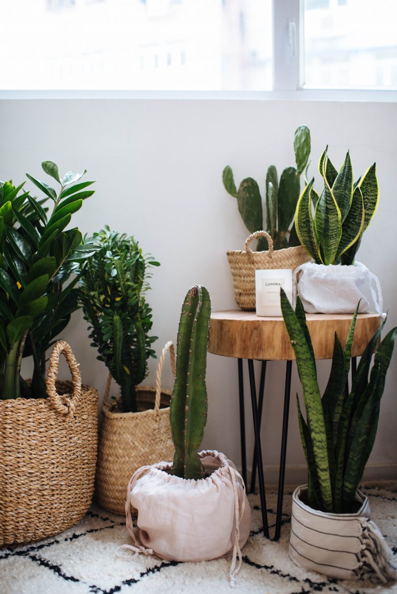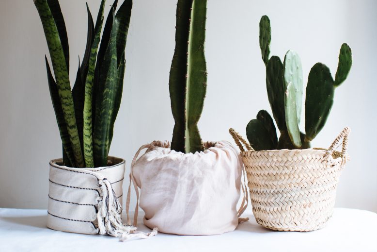 Have you guys noticed that dust bags have become a major part of the packaging of most things you receive online? Handbags, swimwear, jewelry, so many things come in a dustbag now. Which makes sense because they’re lighter than boxes and thus less expensive and more sustainable to post, and they can also be reused which I love. It does mean though that you can sometimes be inundated with dustbags, particularly if you love online shopping like I do! Anyway, I got some lovely linen dustbags from my recent linen sheet order and realized they would be a great option for dressing up some cacti I had at home, looking sad in their brown plastic pots.