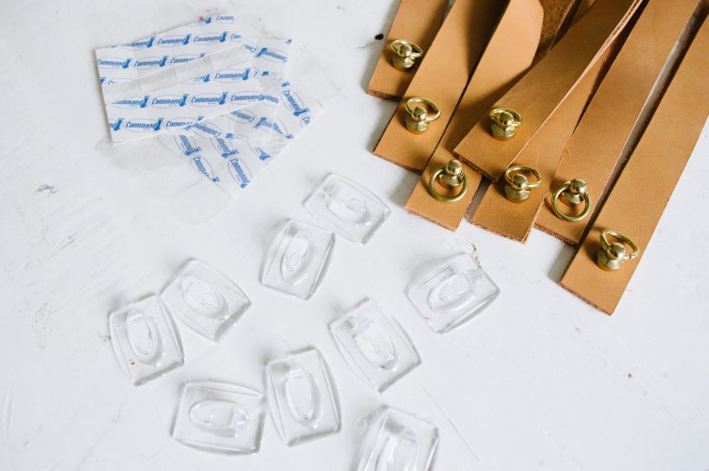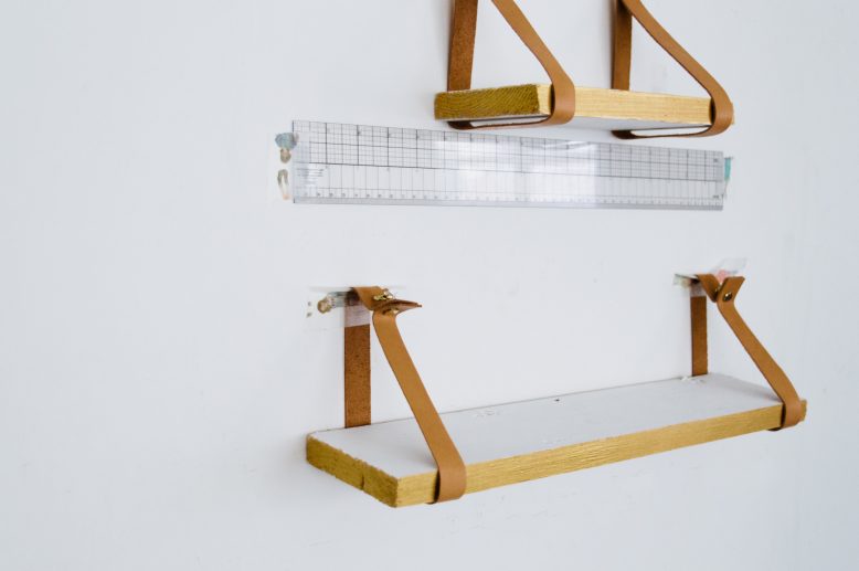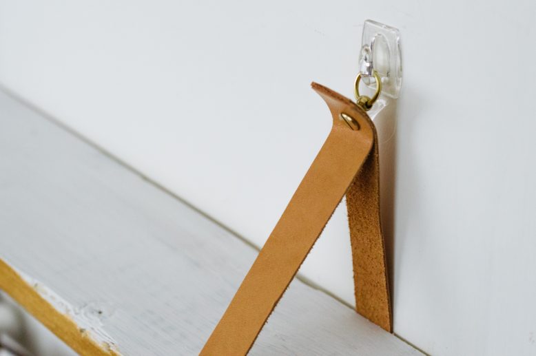 We used a transparent stick-on hook so it wouldn't be as obvious when installed. Be sure to double check instructions on the packaging to make sure the hook can sustain the weight of your shelves without damaging the wall!