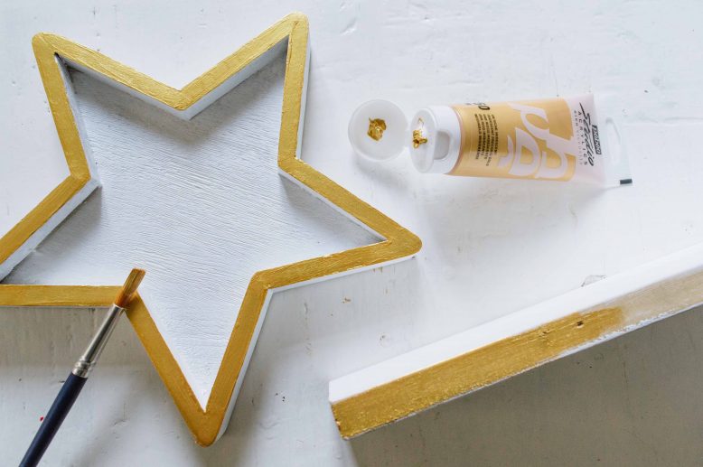 For reference, the 4 pieces of 2.5 cm (1″) thick wood planks we used were 95 cm (37”), 70 cm (28”),40 cm (19”) and 25 cm (10”) wide. But this can be adjusted depending on your liking or the width of your wall. The wooden star was bought from H&M, and is actually a tray, but you can use any sort of star or ornament you like for the top of the tree. We decided to paint our planks white with a gold edge, mainly because our planks were different colours so wouldn’t have looked great bare. You can leave yours bare or paint them any colour you like.
