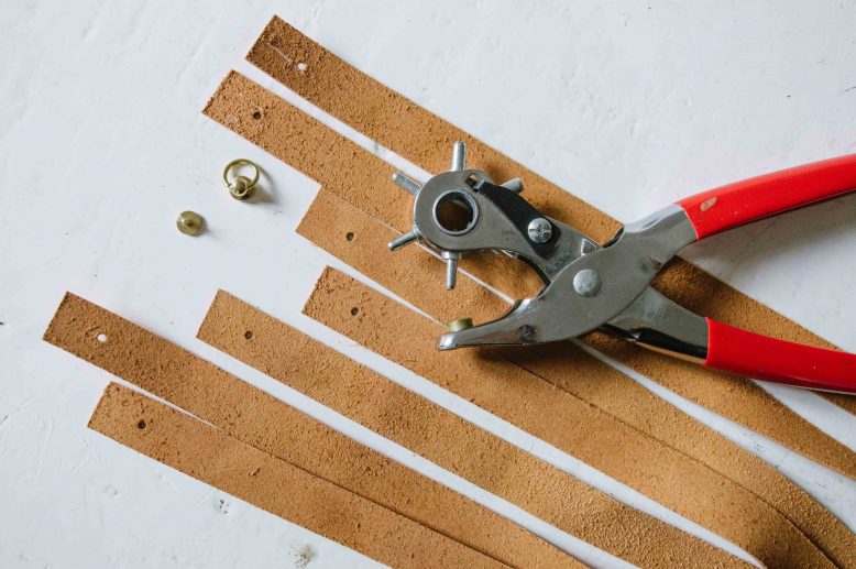 We cut our straps to 41cm (16'') in length.Measure and cut your leather straps,then punch holes into both ends.