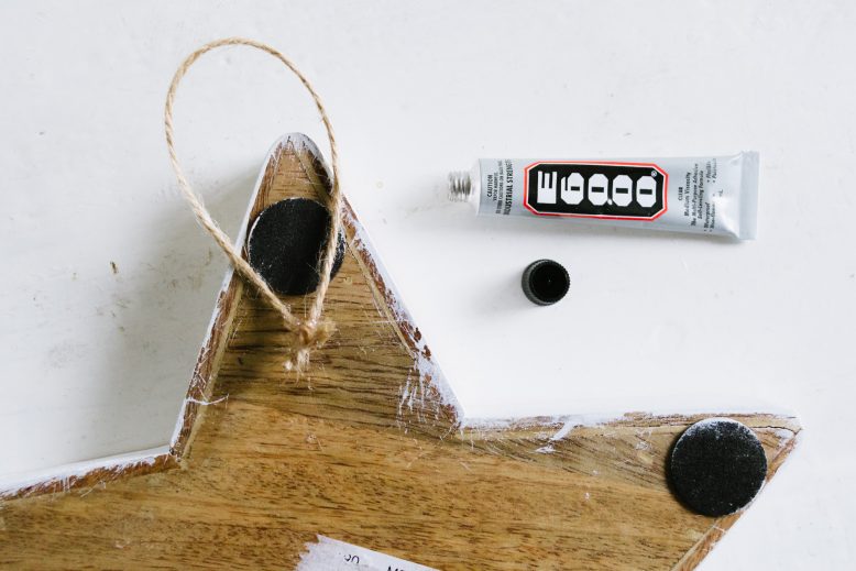 The wooden star has no hooks installed, so we glued on a small hoop of twine for hanging.