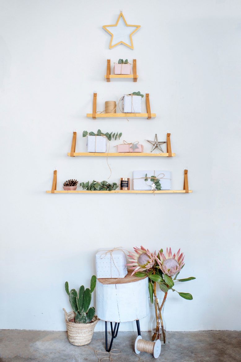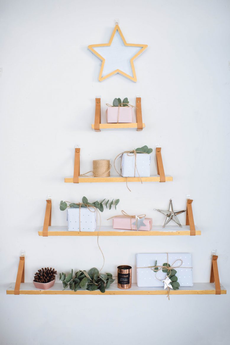 You’ll know that I’m all about the festive spirit, but sometimes an apartment the size of a postage stamp dampens that somewhat. Which is why, year after year I continue to rack my brain for ideas that allow you to have a Christmas tree in your space, when you’ve got pretty much no space at all. When we lived in London I experimented with a post it note christmas tree, and a few years ago I made a DIY string light tree that goes on the wall. This year? I’m all for the shelfies. Leather hanging shelves have become a big part of the decor in my house, so it made sense to integrate that idea with some festive decor. Introducing, the DIY Shelf Christmas Tree! It’s pretty, functional and hypoallergenic… What more could you ask for?!