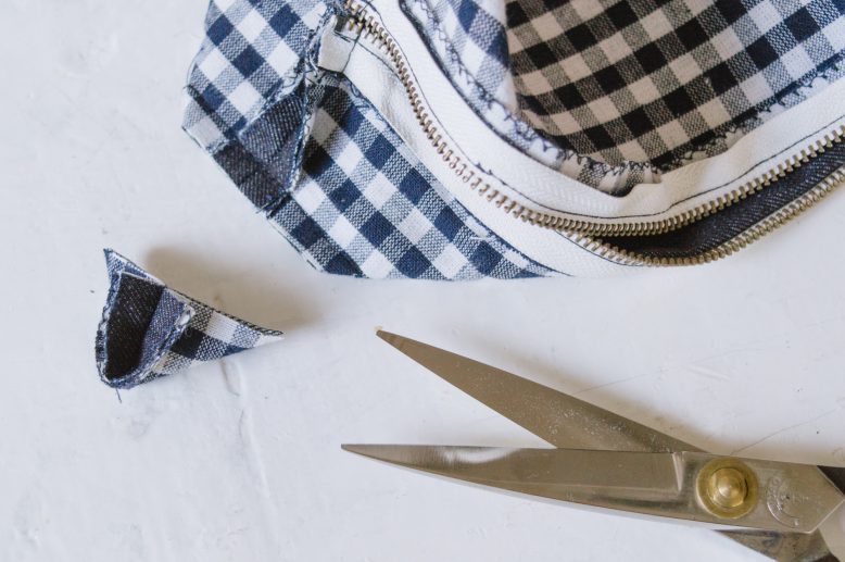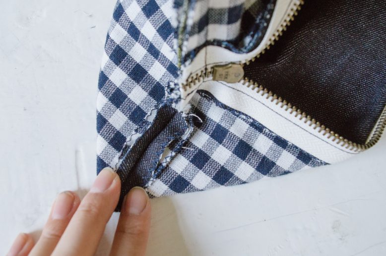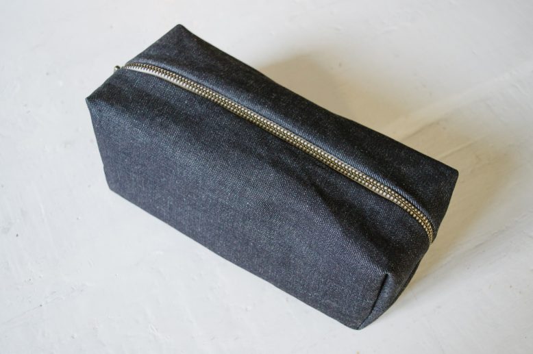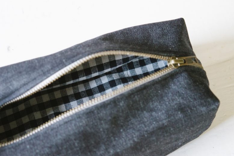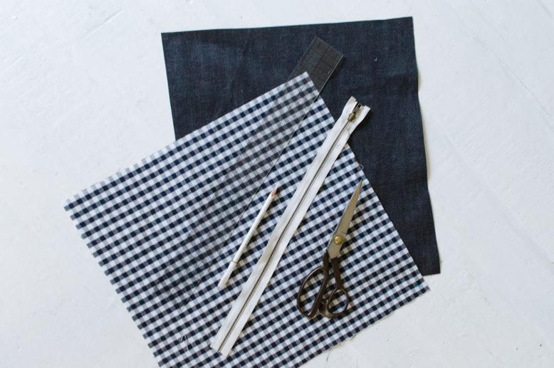 This make up bag uses just two square fabric pieces that are 15” (38cm) x 15” (38cm). We used denim for the outer fabric and a cotton gingham for a contrasting lining. We suggest using a stiffer fabric so the bag can hold its shape, but if you choose a lighter weight fabric, you can iron it with a stiff interfacing.
