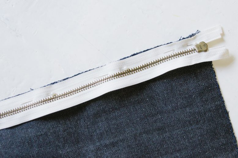 Pull the zipper down halfway, then sew down both sides. Be careful when sewing through the zipper teeth and avoid hitting them with the sewing needle.