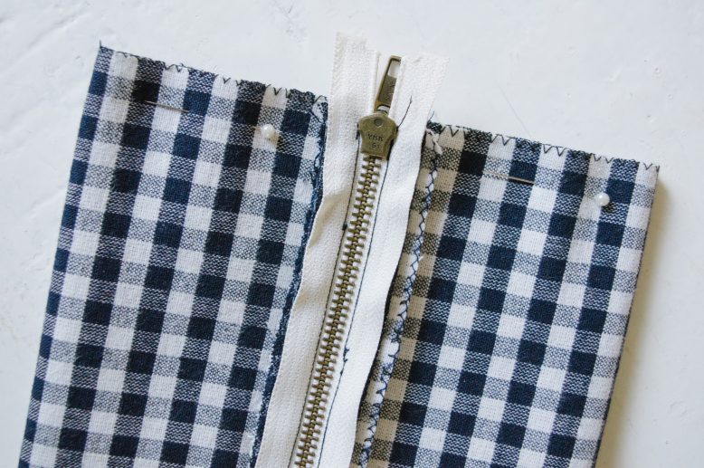 Place the wrong sides of the fabric together, then lay your zipper on one edge, pin and then sew.