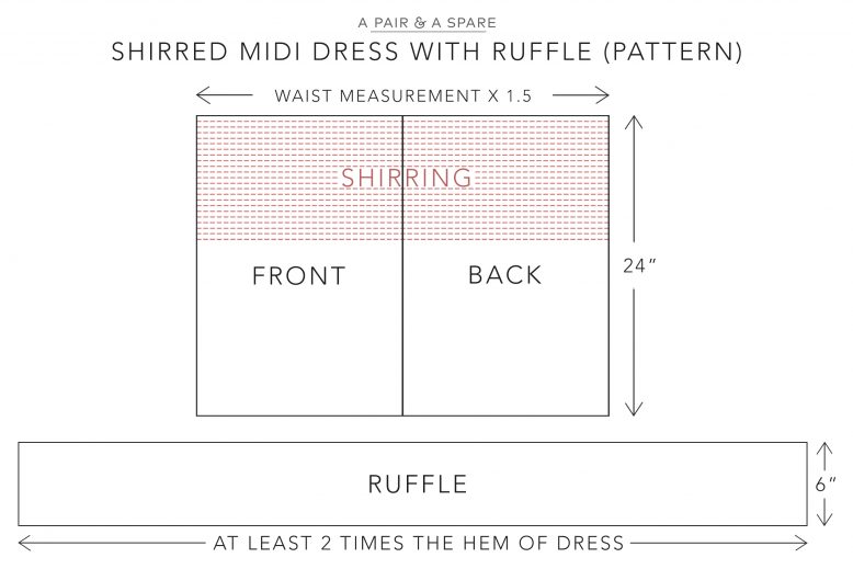 This mini dress uses the same method of shirring that we detailed in this post, except you are going to extend it into a dress and add a ruffle. The total width of the front and back panels need to be 1.5 times that of your waist measurement, since the fabric will shrink after shirring. And the width of the ruffle needs to be at least 2 times that of the dress hem, a larger width will mean more gathers in the ruffles.