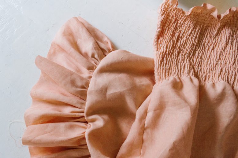 Then shirr the top part of your dress using colored thread for the top thread and elastic thread in the bobbin. Use the method we detailed here. Fold and sew the top edge down.