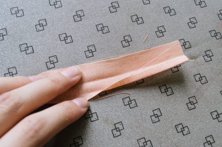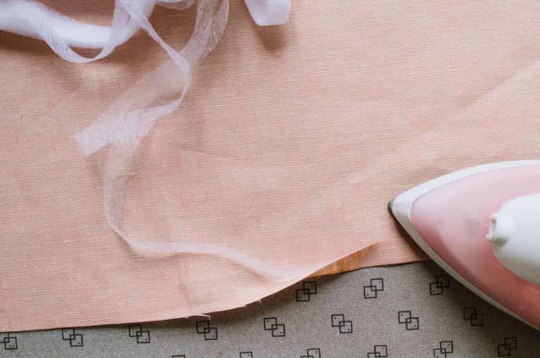 To create straps, fold two sides of the fabric strip towards the center, then fold them together closed again as you iron it shut with fusing tape. Then attach the straps to the top edge of your dress.