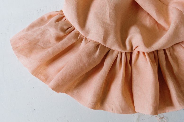 Finish the top and bottom hem of the dress and the ruffle hem piece, either rolling and sewing down or using fusing tape.