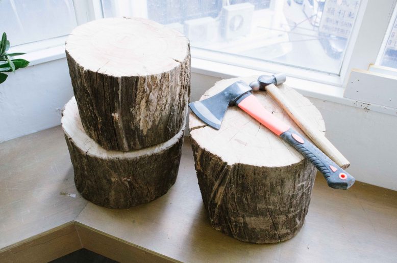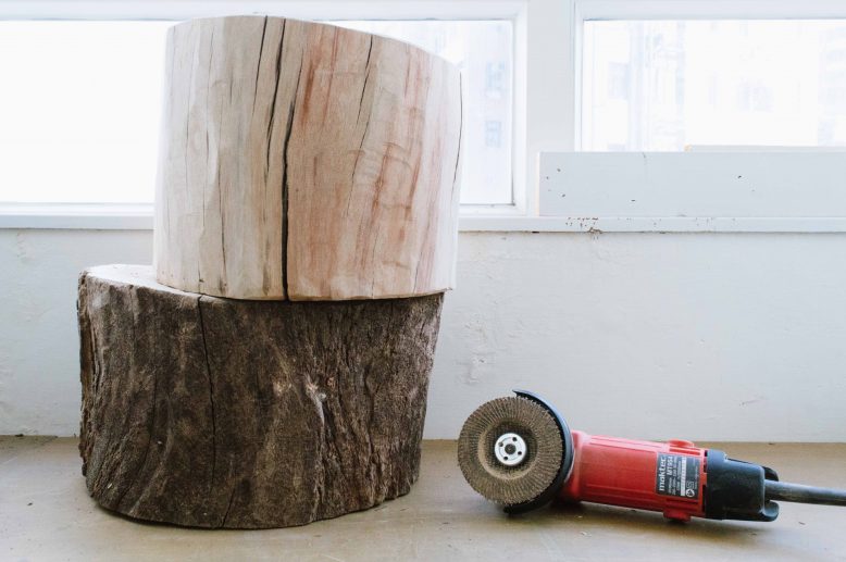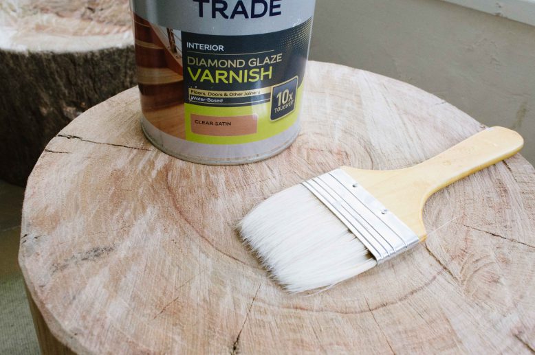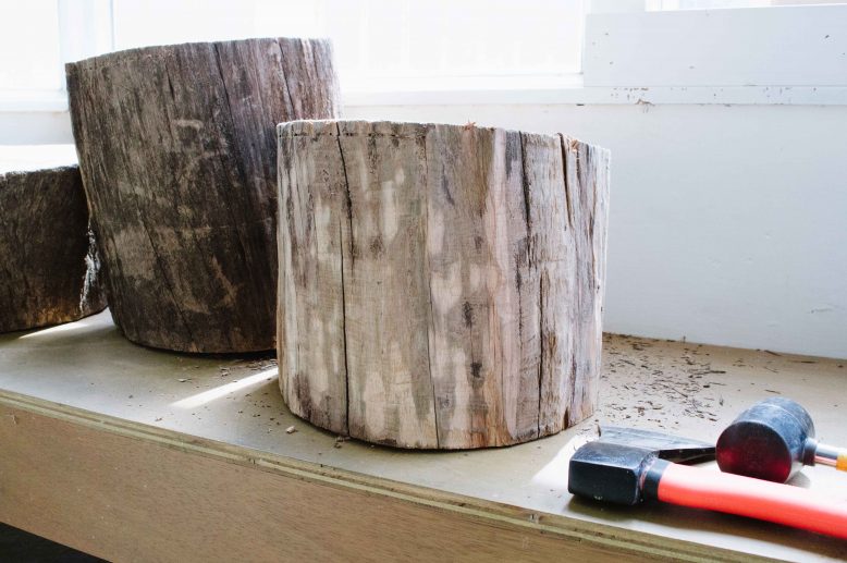First, you’ll need to get your hands on a stump. There are lots of options for this, like a lumber yard, but a big storm in our neighbourhood saw lots of fallen trees, something that’s always very sad, but (after the appropriate mourning period) my mind went to how I could work my DIY magic on the leftover stumps. Ben was promptly enlisted to help in the retrieval, and luckily he’s a man who likes a task, because with minimal complaint we hauled them into the studio. Note: it was backbreaking because they weigh about 25kg each, so don’t expect to move them a lot once they’re done!