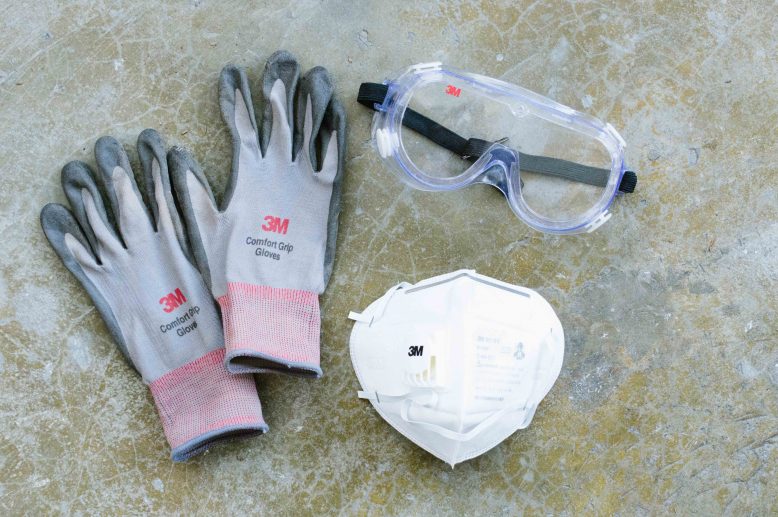 Very important thing to note: When using a rotary sander, wear a pair of safety goggles and a respirator mask. You don't want to be breathing in the fine sawdust from the sanding process, or have a piece of wood fly into your face! A pair of non-slip working gloves is also always handy.