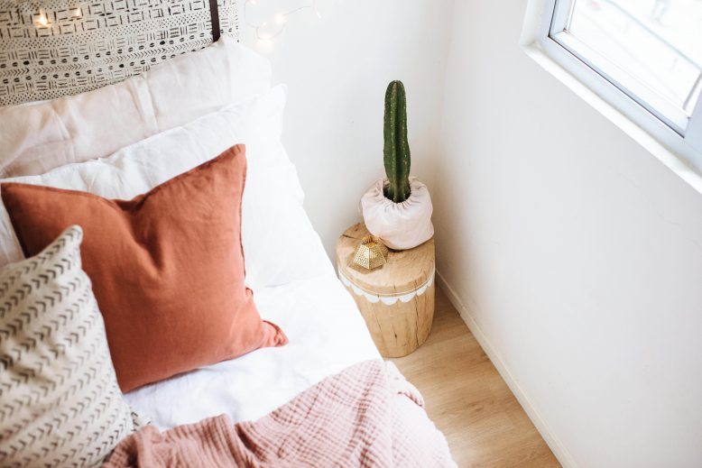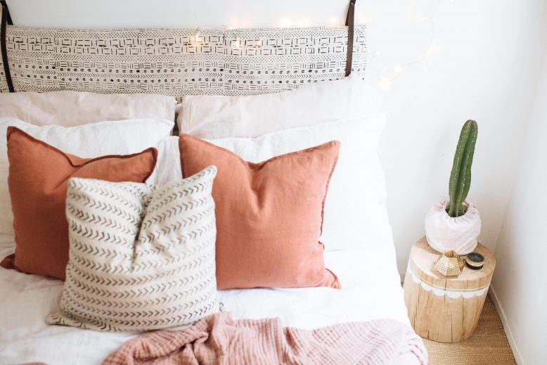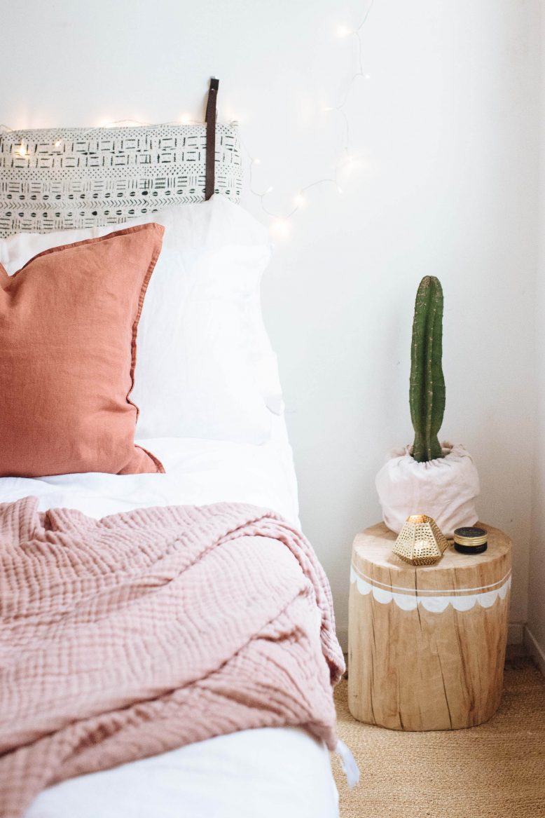 Decor items: DIY stump stool, Linen bedding from Cultiver, Dusty Pink Throw, Rust cushions and gold tea light candle holder from H&M Home, travel candle from Lumira, DIY headboard, DIY Mud cloth cushion.