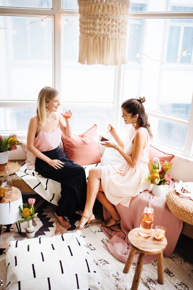 But seriously though, I have to say that I’m down with the whole Galentines movement. I mean, when do you get to celebrate your favourite gals? Add the fact that the whole movement was (in my mind) spearheaded by Leslie Knope and you’ve got me hook line and sinker. A few days ago, we put together a little cocktail and cake session in the studio with a few of my friends to celebrate the fact that this ‘love holiday’ isn’t just for couples. First, we decked out the space with a few DIYs, then we hopped into some favourite Grana silk items, and then tucked into some yummy raw cake and cocktails. Oh and in case you’re looking for something fancy to wear this Valentines/Galentines and beyond, look no further than Grana’s new silk collection, so many nice styles there just in time for Spring! Scroll on for more.