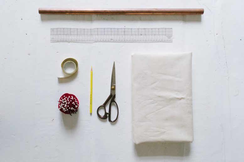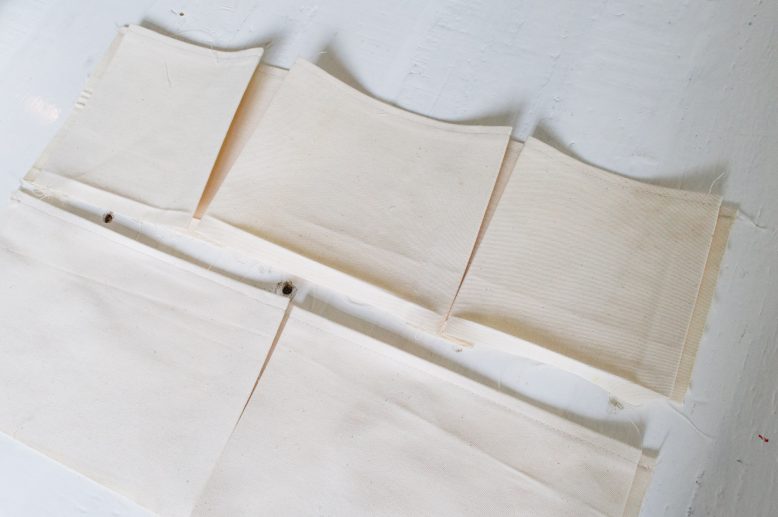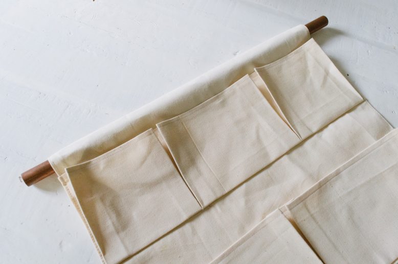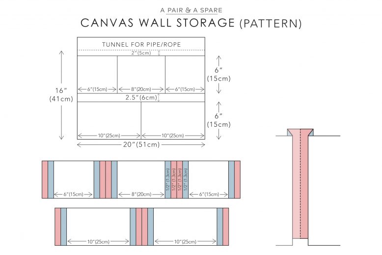 Feel free to adjust the dimensions and number of pockets to your liking. For the one we made, it’s 20” (51 cm) x 16″ (41 cm), with 3 pockets on the top row and 2 on the bottom. Each pocket will need two 1/2″(1.3cm) extending folds on either side, as illustrated in the diagram. So it doesn’t matter how many pockets you decide to do, just remember to add 1″ for the folds on either side of the pocket during the drafting process. Remember to also add an extra allowance for the top to accomodate a copper tube or rope for hanging on walls.
