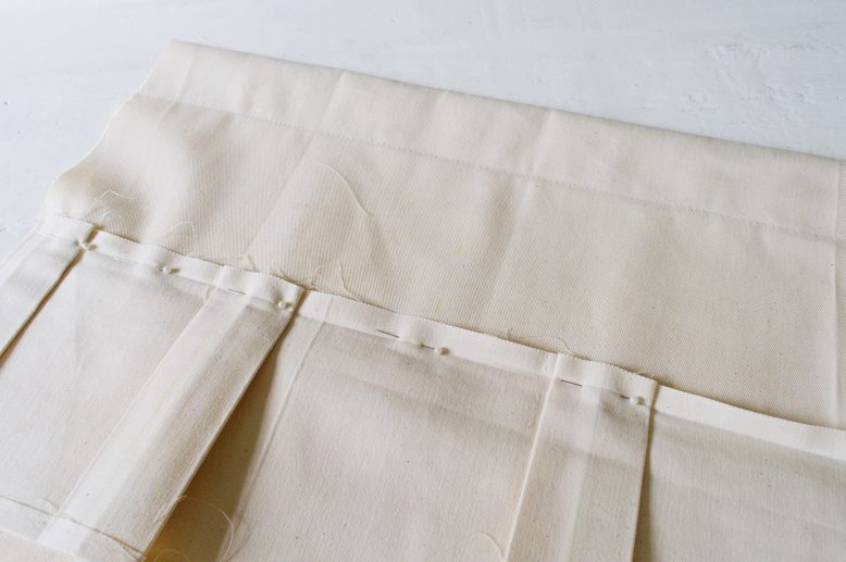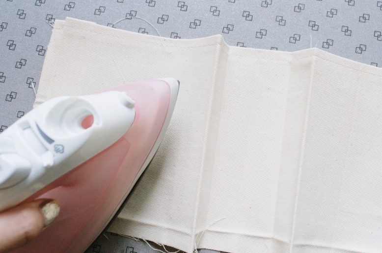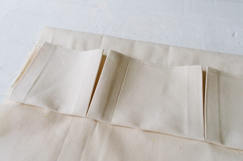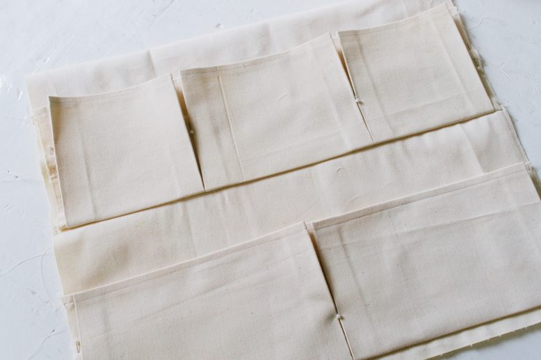 Fold and iron the top and bottom seams of the pockets first, and sew or fuse the top seam closed. Then mark, fold, and iron the fold lines in between the pockets.