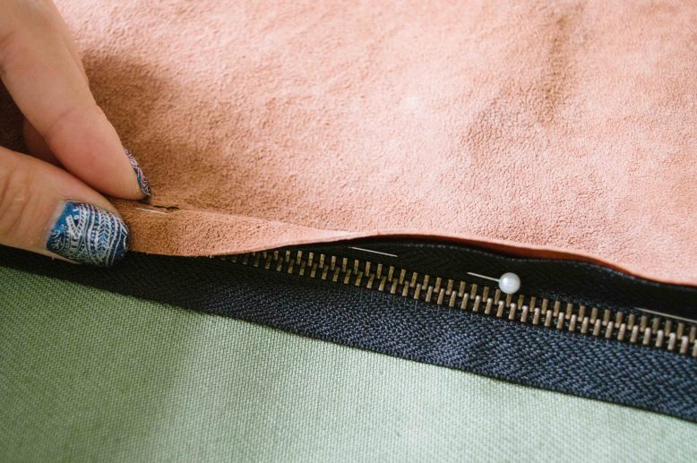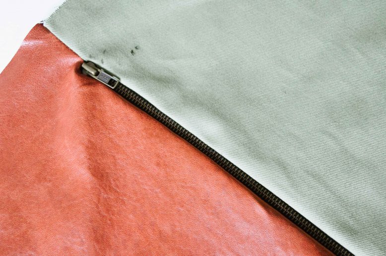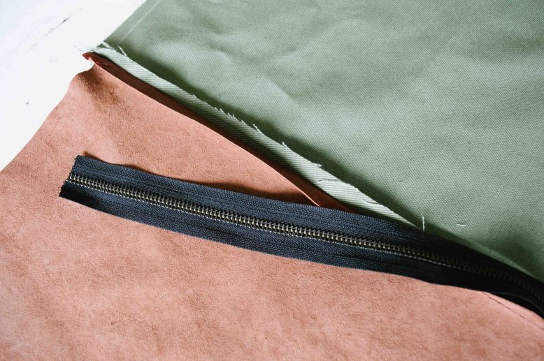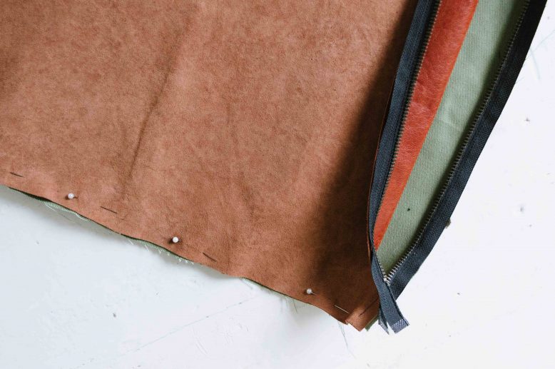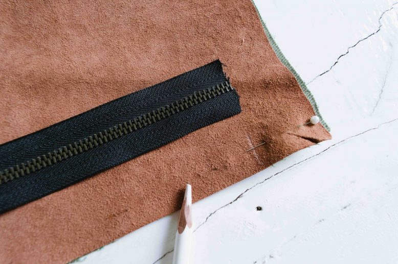 The covers we made have leather for one side and canvas fabric for the other. Place the right sides of your leather and fabric piece together and mark the placement of your zipper. The zipper should be slightly shorter than the edge of your cover.
