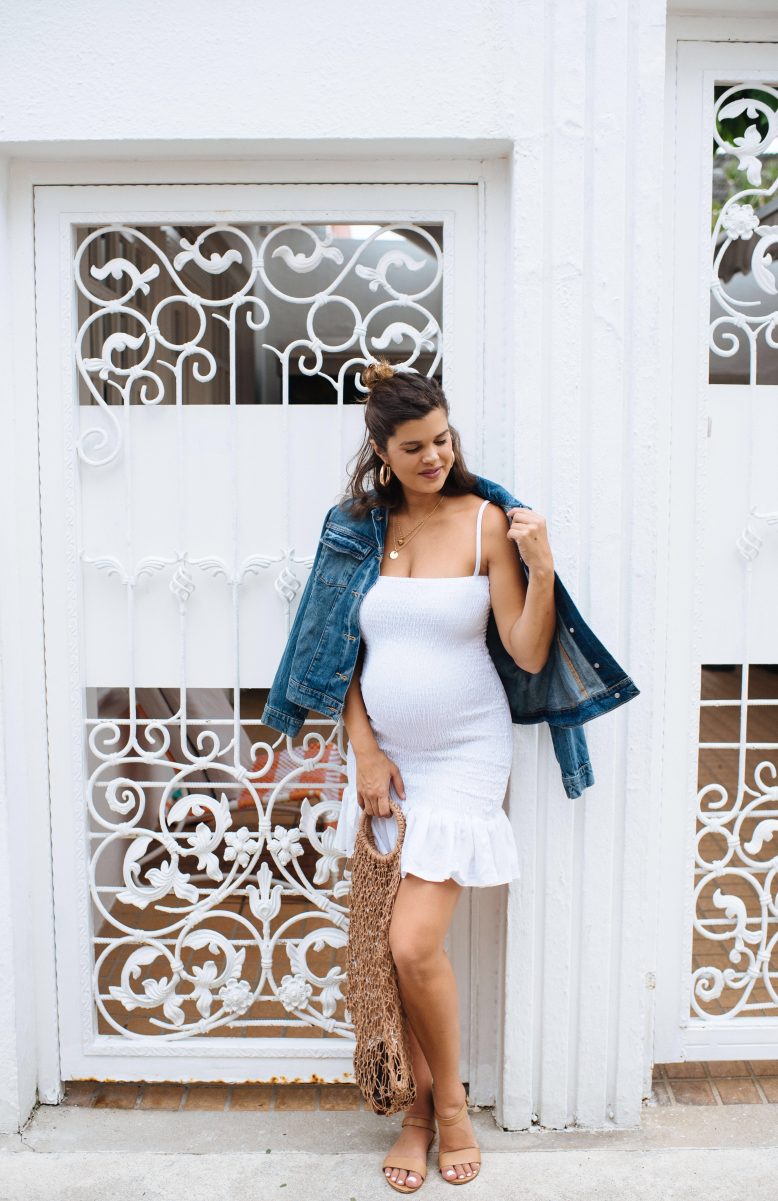 When asked, so many of you guys recommended that I get into the body-con silhouette when it came to dressing the bump. And whilst I know that it’s one of the best styles for creating a more streamlined silhouette, for some reason I’ve struggled to get into it. I guess I found it hard to get my hands on any styles I truly loved, and there was also the element of not really wanting to draw too much attention to the bump (particularly when you’re not feeling your best!). That said, I’m a true believer in the whole look good feel good mantra, so thought it was about time to give it a go. I noticed that shirred tube dresses are everywhere at the moment, on the high street, at Zimmermann and just about everywhere else. So I thought it a good place to start in the bodycon department… With a denim jacket thrown over! Scroll down to see just how to make this DIY shirred bodycon dress!