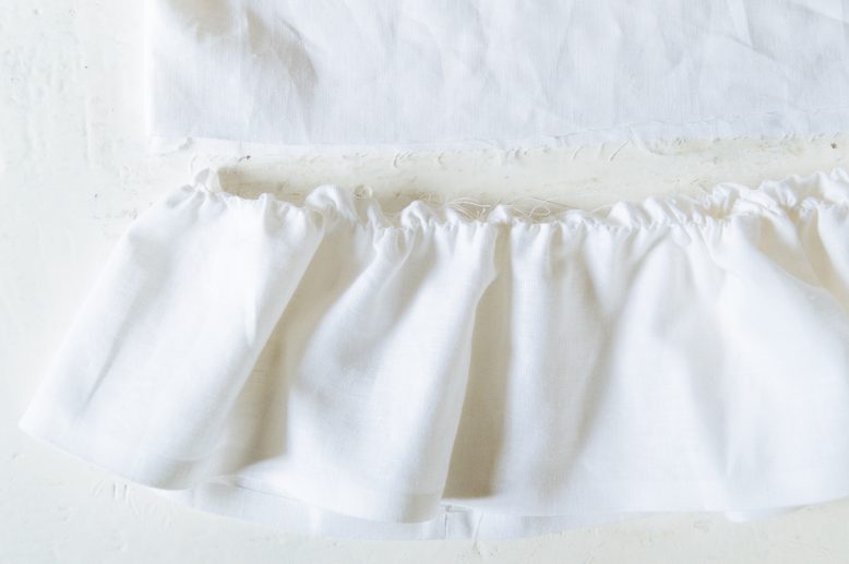 Sew a straight stitch on the top edge of the ruffle using the longest stitch setting and the lowest tension setting. We recommend using thicker thread so it won't snap so easily when you're gathering the ruffles.